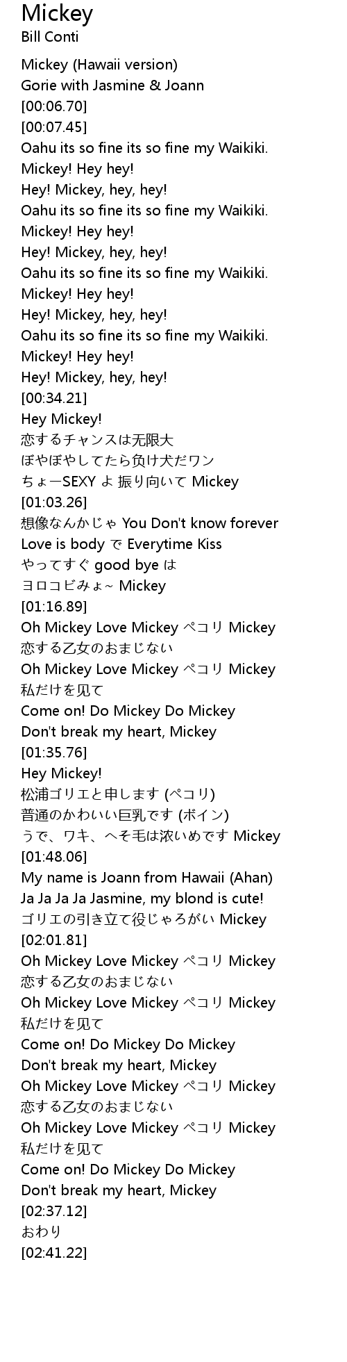 | [02:04.37] | Oh Mickey Love Mickey Mickey |