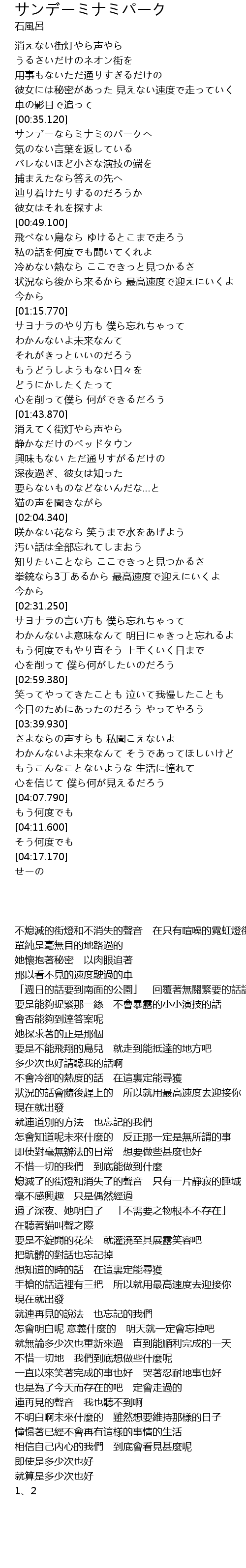 | [00:35.800] | サンデーならミナミのパークへ 気のない言葉を返している |