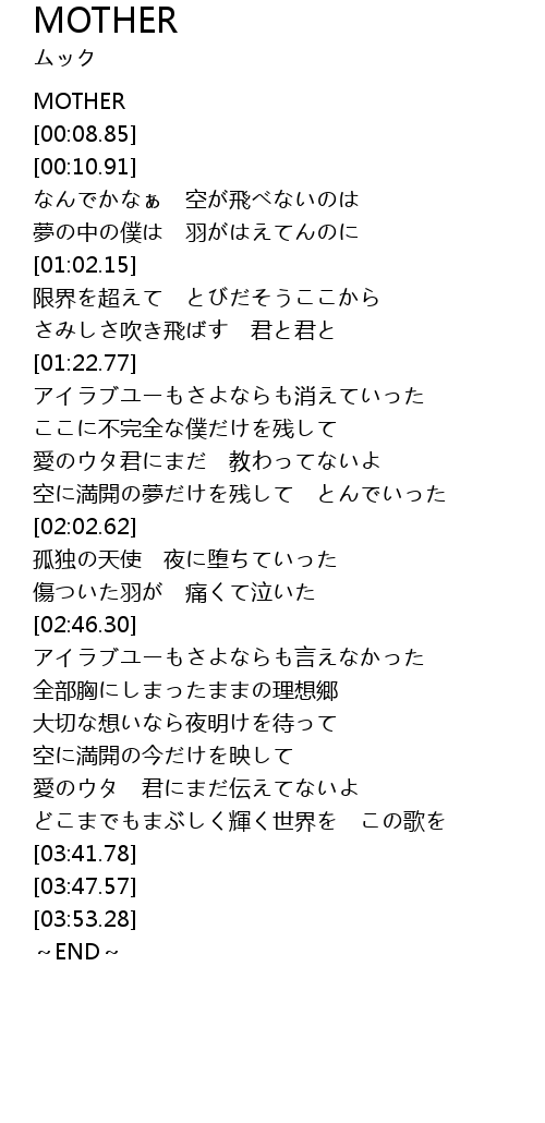 | [00:42.17] | なんでかなぁ 空が飛べないのは |