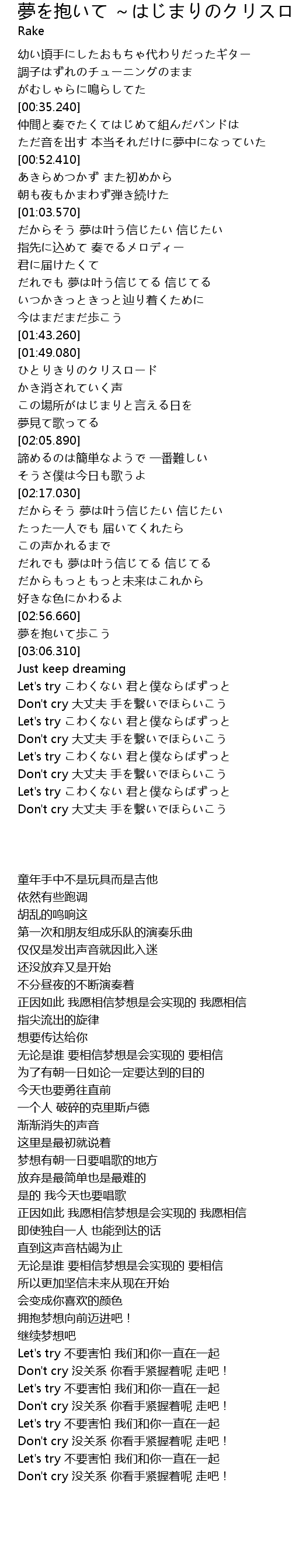 | [03:33.930] | Don't cry 大丈夫 手を繋いでほらいこう |