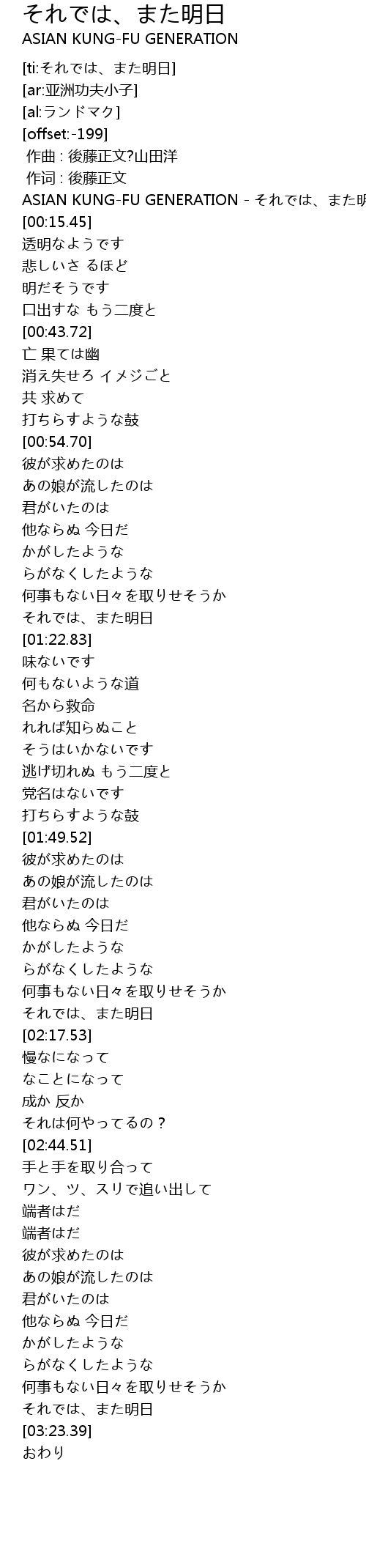 | [00:00.42] | ASIAN KUNG-FU GENERATION - それでは、また明日 |