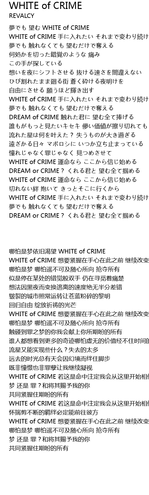 | [00:09.40] | WHITE of CRIME 手に入れたい それまで変わり続ける |