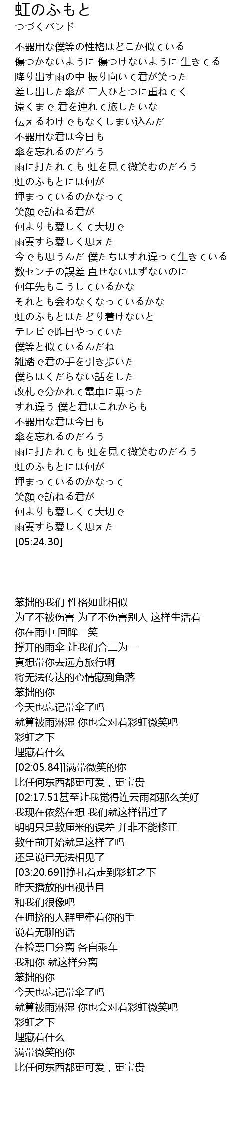 | [01:45.13] | 雨に打たれても 虹を見て微笑むのだろう |