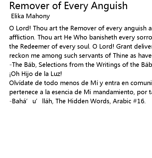 | O Lord! Thou art the Remover of every anguish and the Dispeller of every affliction. Thou art He Who banisheth every sorrow and setteth free every slave, the Redeemer of every soul. O Lord! Grant deliverance through Thy mercy and reckon me among such servants of Thine as have gained salvation. | |