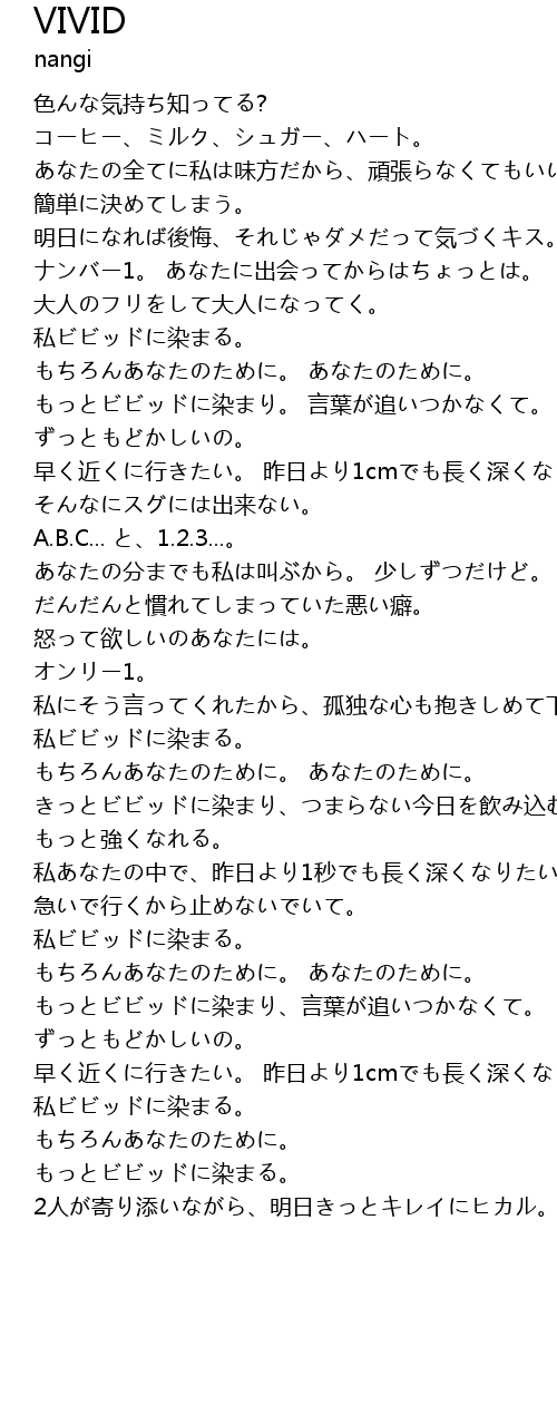 | もっとビビッドに染まり。 言葉が追いつかなくて。 ずっともどかしいの。 | |