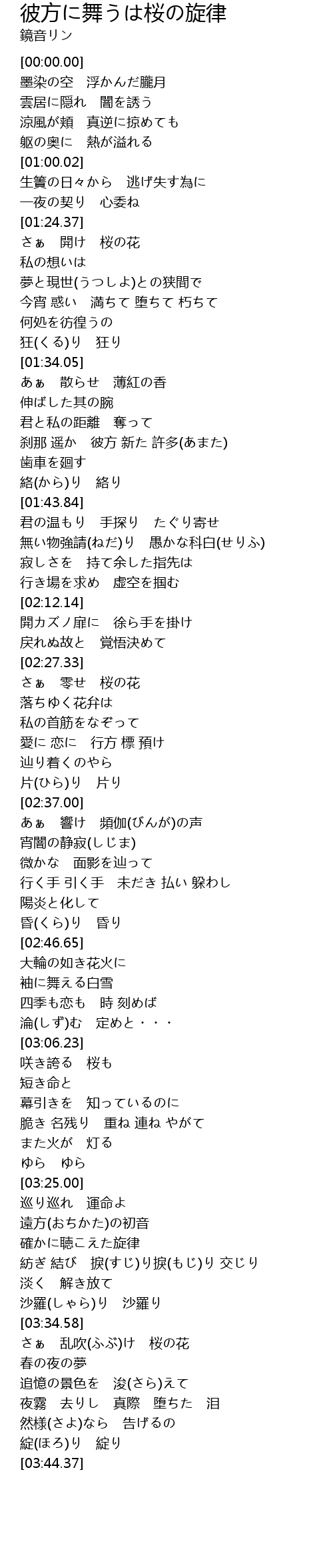 | [03:34.63] | さぁ 乱吹(ふぶ)け 桜の花 |