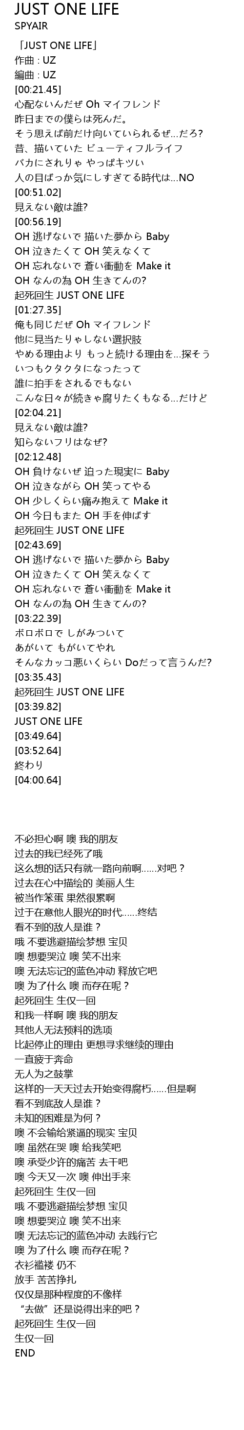 | [03:36.14] | qǐ sǐ huí shēng JUST ONE LIFE |