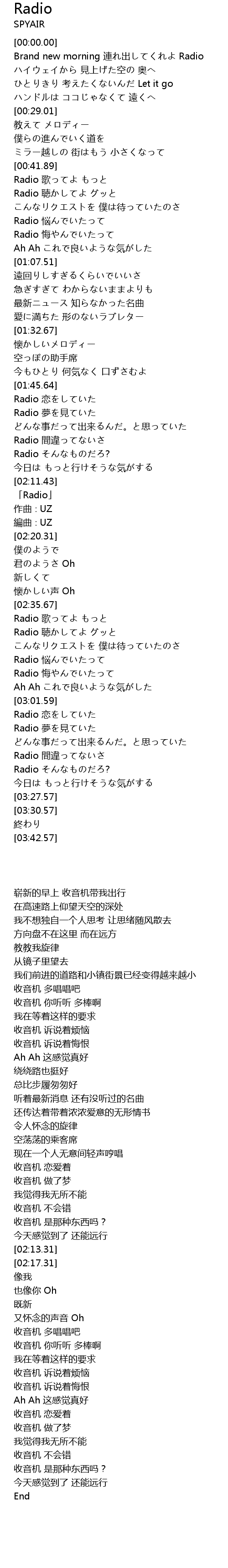 | [00:05.38] | Brand new morning 連れ出してくれよ Radio |