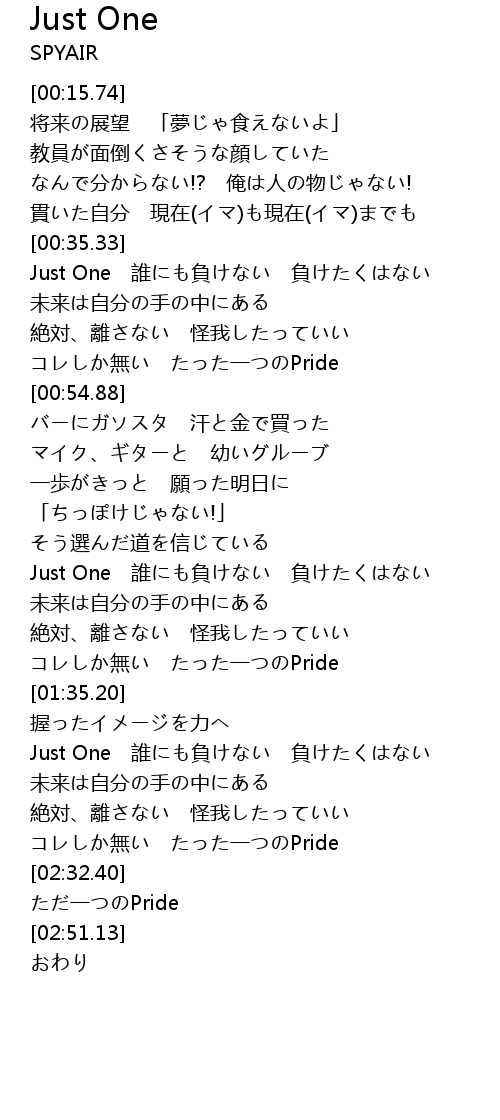 | [02:13.97] | Just One 誰にも負けない 負けたくはない |