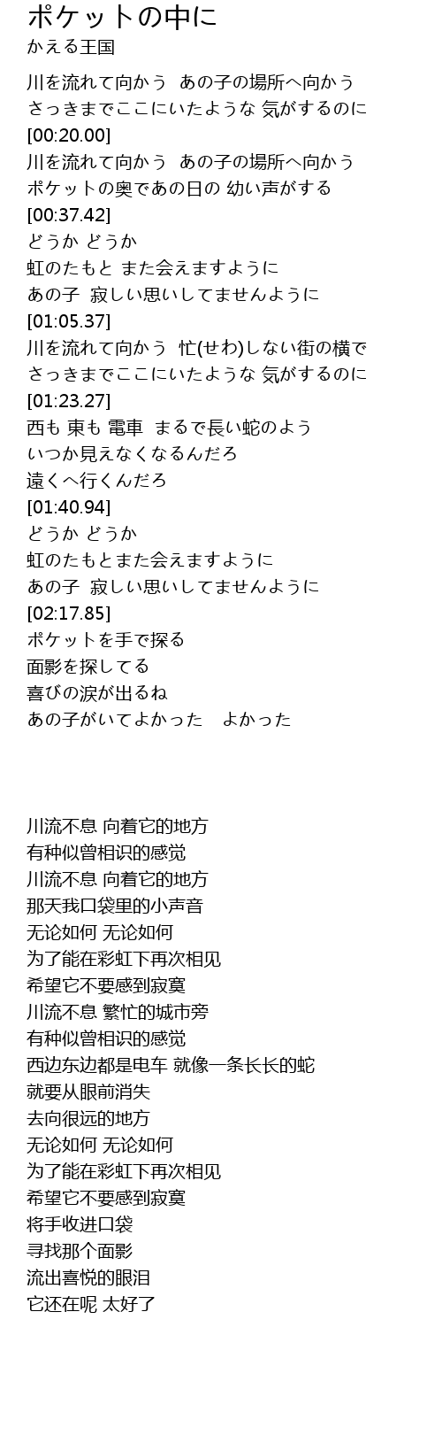 | [00:21.00] | 川を流れて向かう あの子の場所へ向かう |