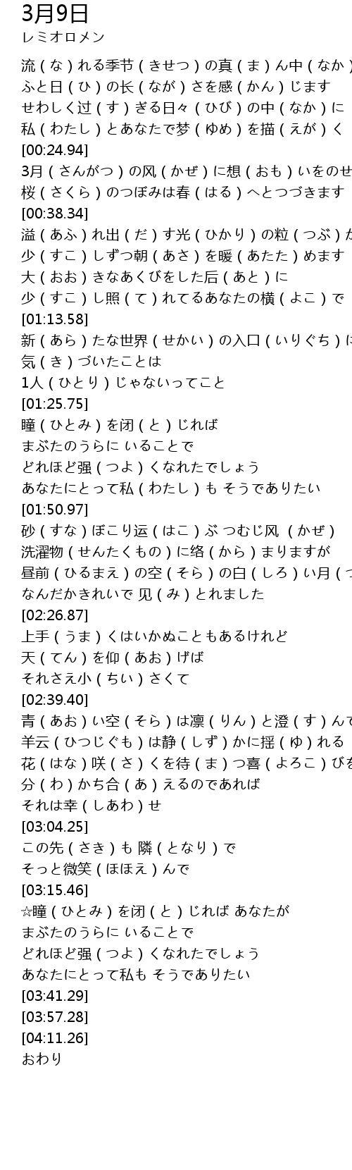 | [00:25.38] | 3月(さんがつ)の风(かぜ)に想(おも)いをのせて |