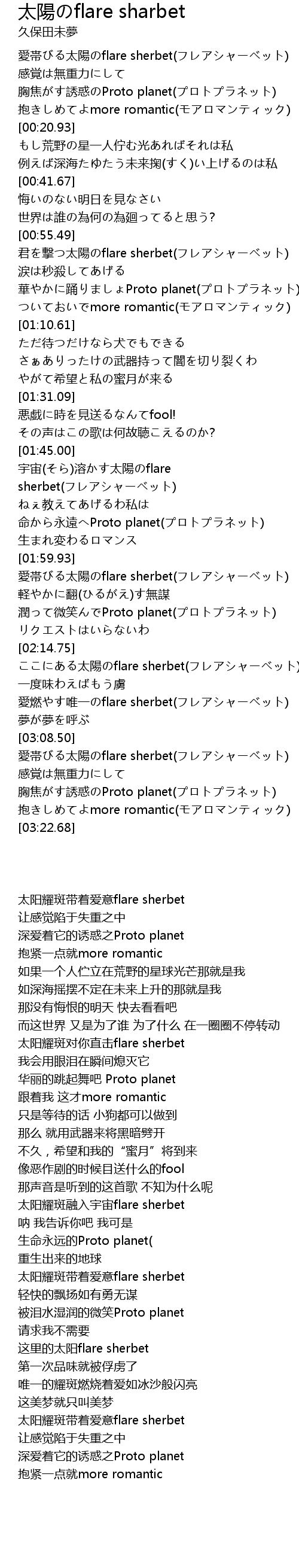 | [02:00.20] | 愛帯びる太陽のflare sherbet(フレアシャーベット) |
