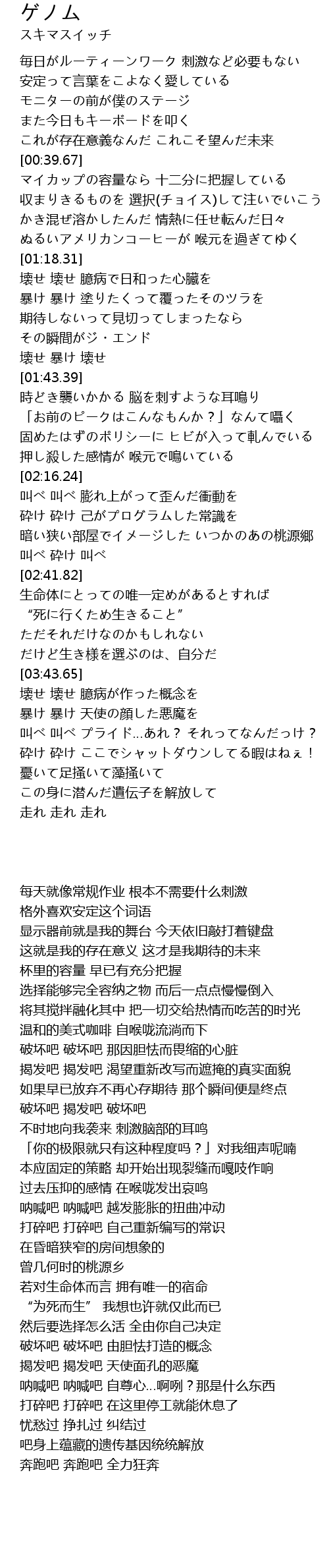 | [04:13.83] | 憂いて足掻いて藻掻いて この身に潜んだ遺伝子を解放して |