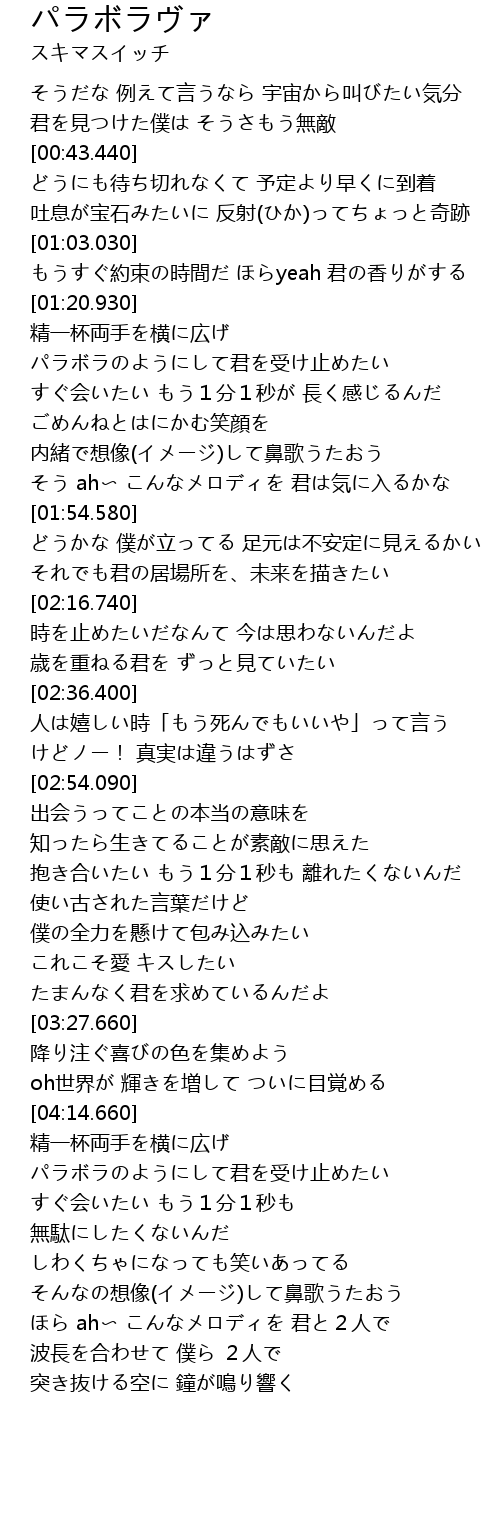 | [04:17.910] | 精一杯両手を横に広げ パラボラのようにして君を受け止めたい |