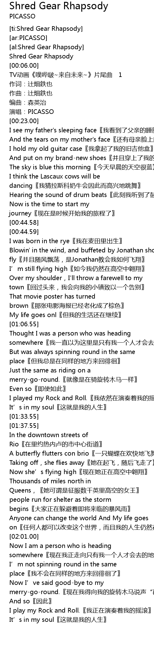 | [00:43.00] | Now is the time to start my journey xiàn zài shì shí hòu kāi shǐ wǒ de lǚ chéng le |