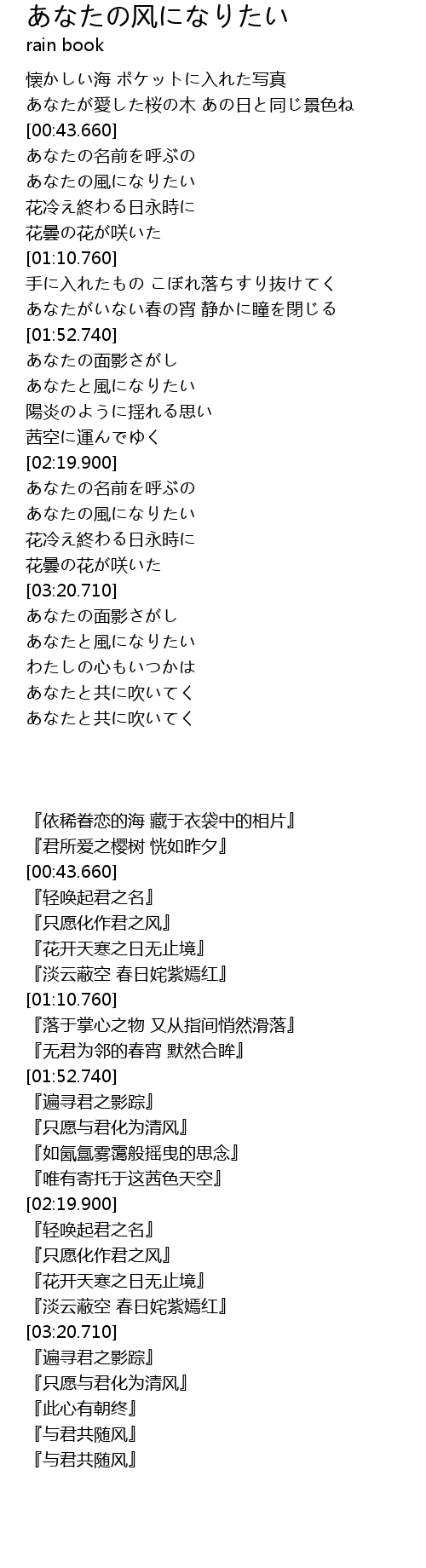 | [01:41.110] | あなたがいない春の宵 静かに瞳を閉じる |