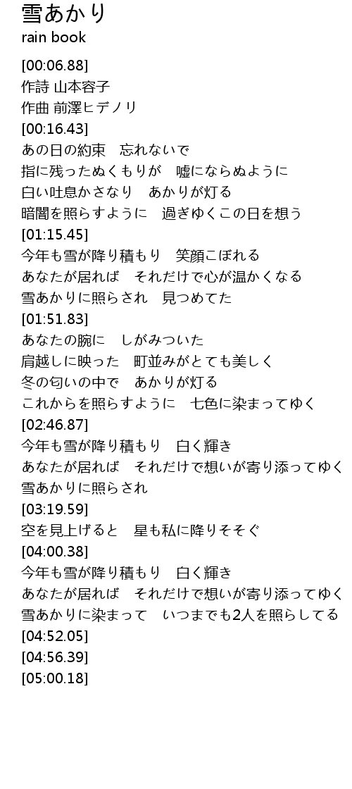 | [04:32.67] | 雪あかりに染まって いつまでも2人を照らしてる |