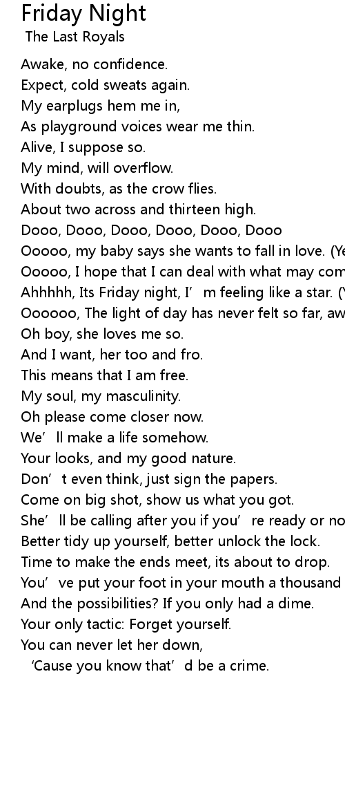 | Ahhhhh, Its Friday night, I’m feeling like a star. (Yeah-yeah) | |