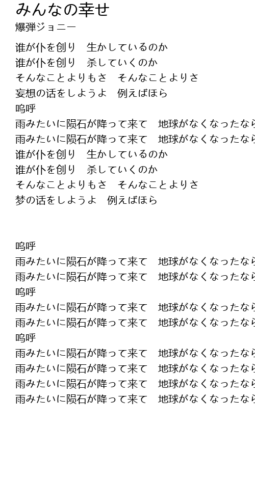 | 雨みたいに陨石が降って来て 地球がなくなったならハッピーだぜ | |