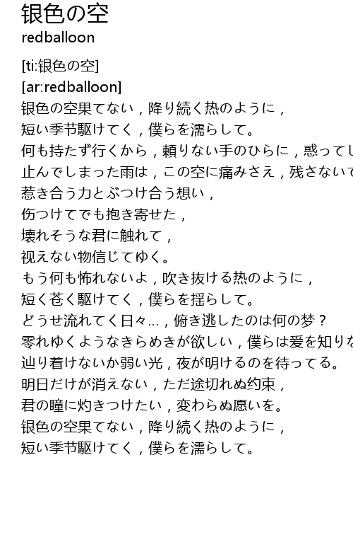 | [00:05.582] | 银色の空果てない,降り続く热のように, |