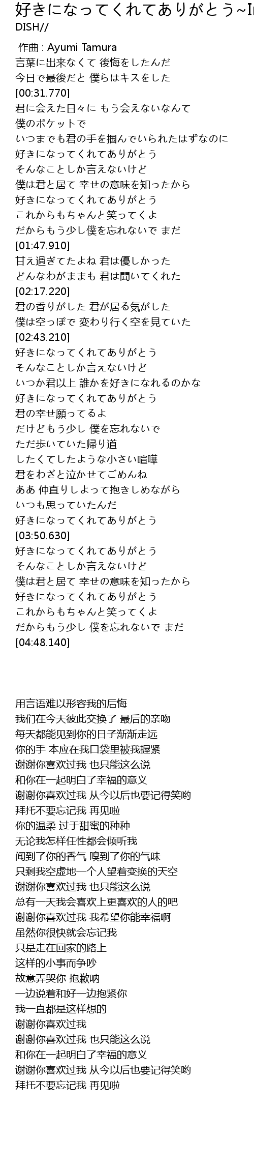 | [04:22.580] | 好きになってくれてありがとう これからもちゃんと笑ってくよ |