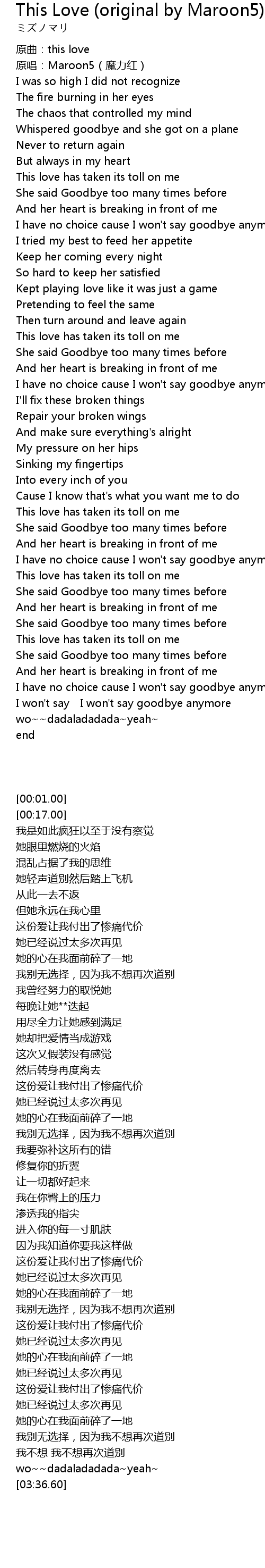 | [00:17.00] | 原唱:Maroon5(魔力红) |
