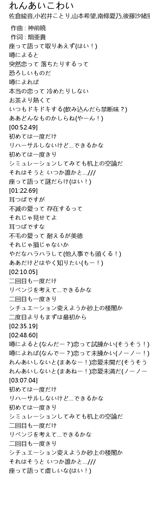| [02:58.12] | れんあいしないと(まあなー!)恋愛未聞だ(そうそう!) |