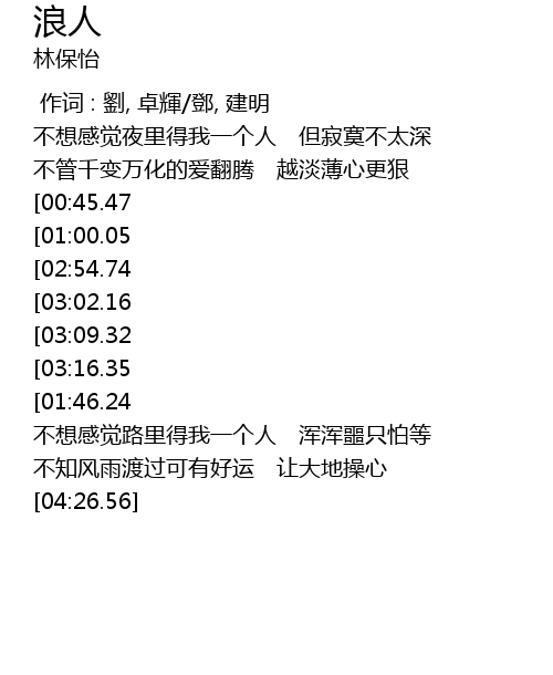 | [04:14.28][03:16.35][01:34.93] | 只怕我 不再有耐心 早已是个浪人 |
