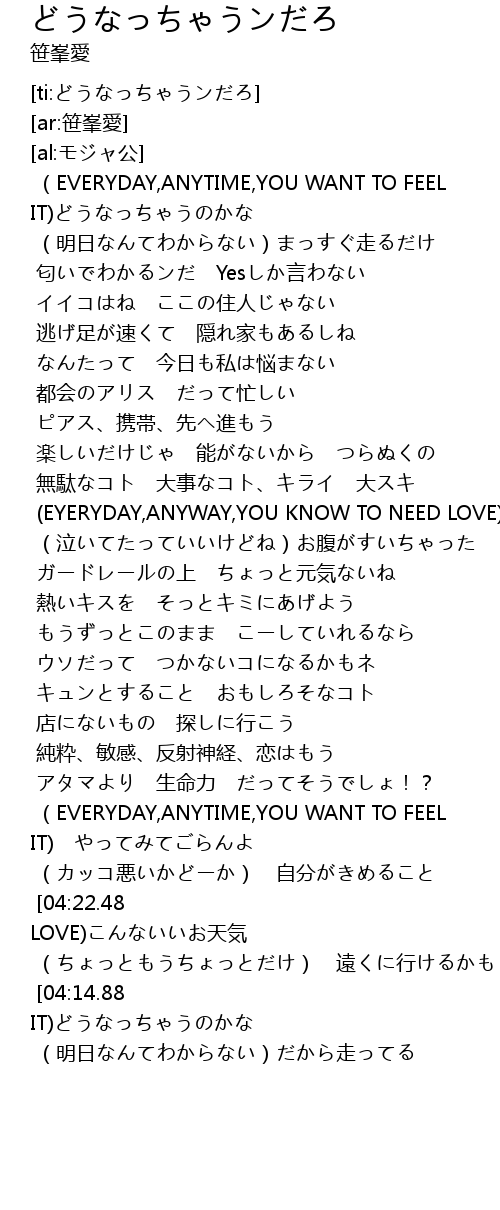 | [04:29.98] [04:14.88] [03:52.29] | (EVERYDAY,ANYTIME,YOU WANT TO FEEL IT)どうなっちゃうのかな |