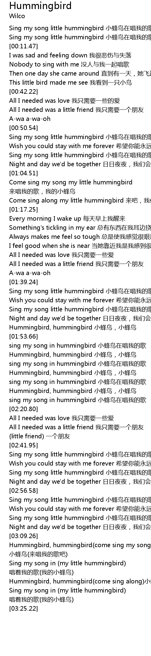 | [03:16.27] | Hummingbird, hummingbird(come sing along)小蜂鸟(来吧一起唱) |