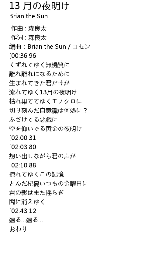| [00:33.11] | 流れてゆく13月の夜明け |