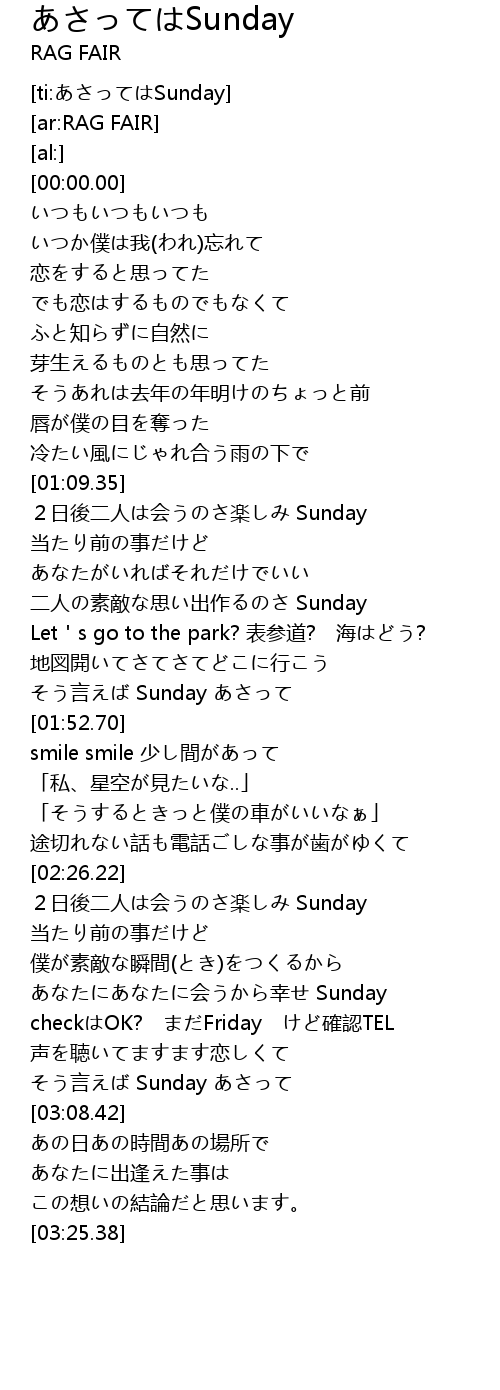| [02:45.36] | あなたにあなたに会うから幸せ Sunday |