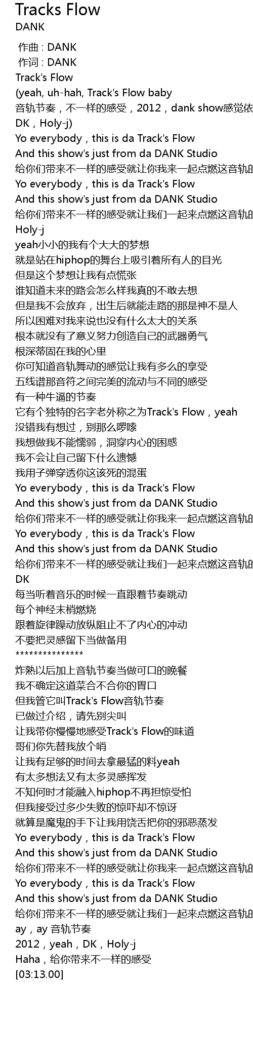 | [00:07.84] | (yeah, uh-hah, Track's Flow baby 音轨节奏,不一样的感受,2012,dank show感觉依旧,yeah, DK,Holy-j) |
