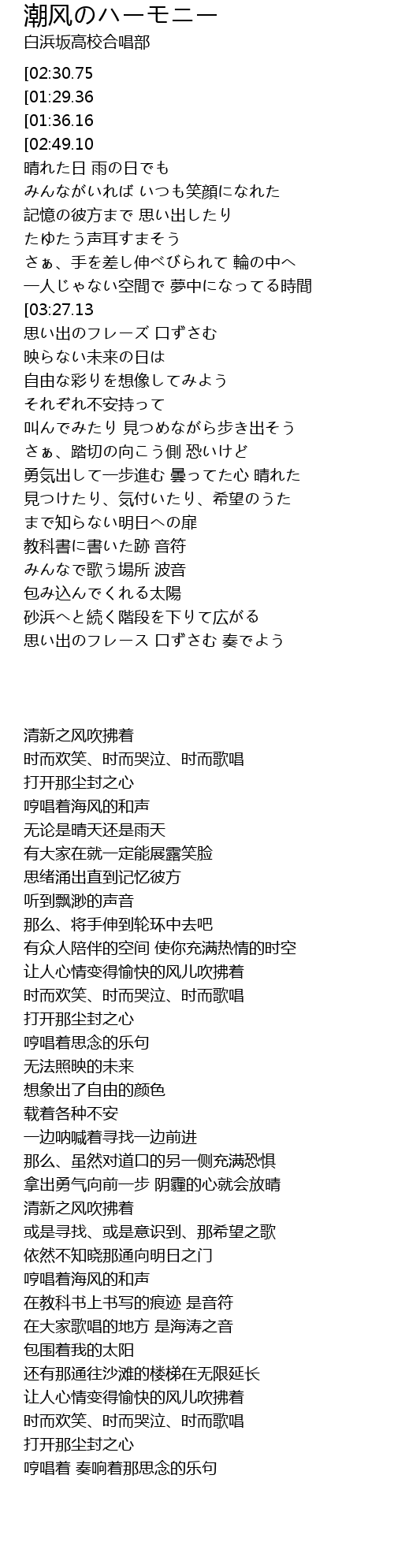 | [00:20.13][02:49.10] | 潮風のハーモニー 口ずさむ |