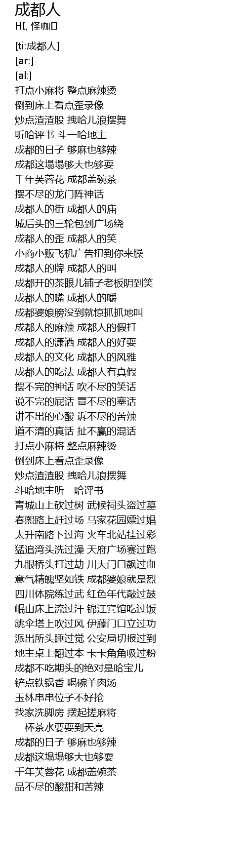 | [01:14.63] | 成都人的牌 成都人的叫 |