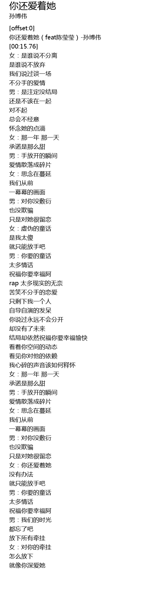 | [00:03.58] | 你还爱着她(feat陈莹莹)-孙博伟 |