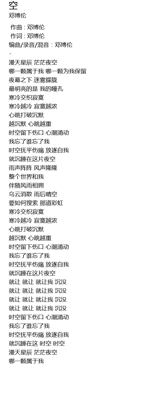 | [00:18.029] | 编曲/录音/混音:邓博伦 |