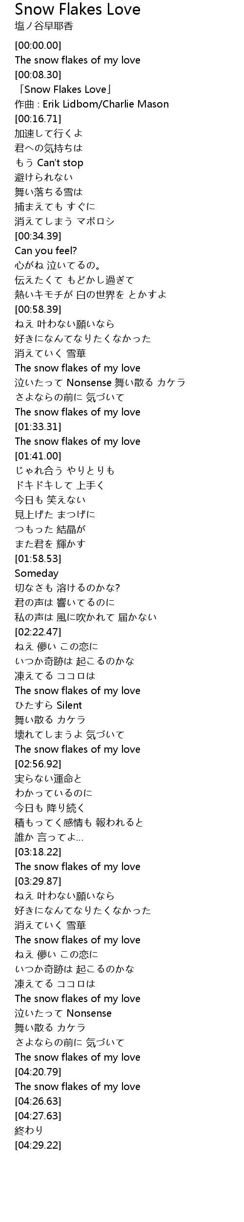 | [00:50.57] | 熱いキモチが 白の世界を とかすよ |