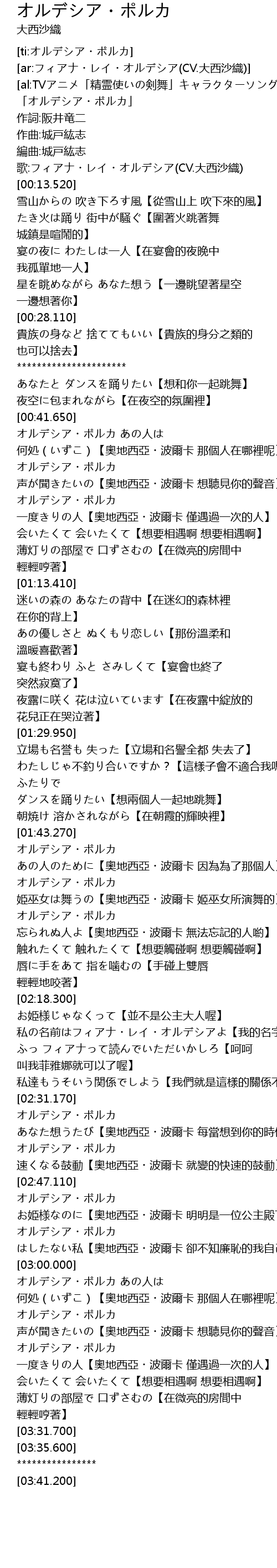 | [03:01.340] | オルデシア・ポルカ あの人は 何処(いずこ)【奧地西亞・波爾卡 那個人在哪裡呢】 |