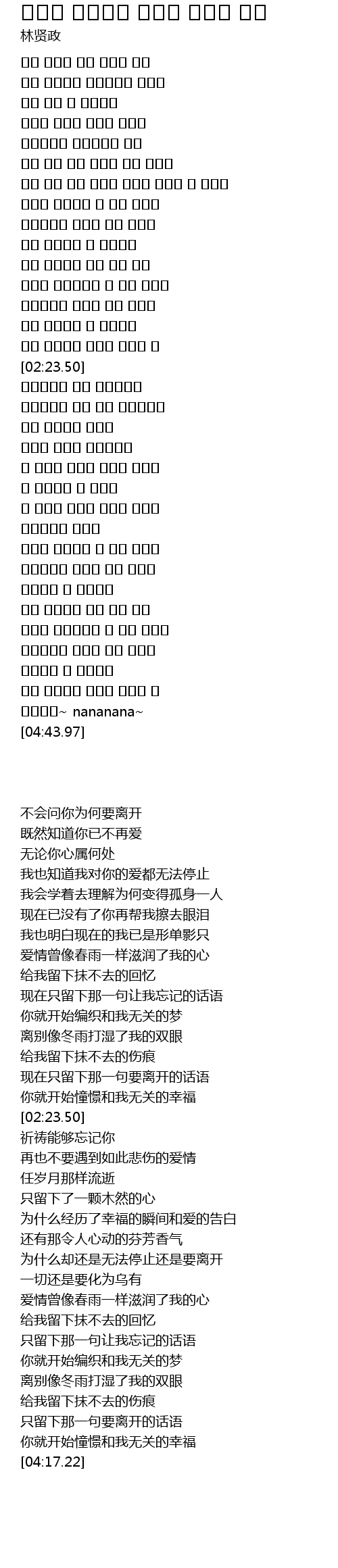 | [00:38.77] | 묻지 않을께 네가 떠나는 이유 |