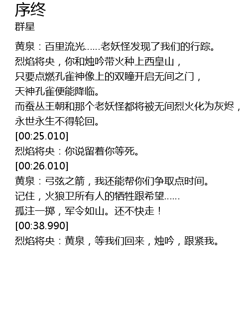 | [00:39.890] | 烈焰将央:黄泉,等我们回来,烛吟,跟紧我。 |
