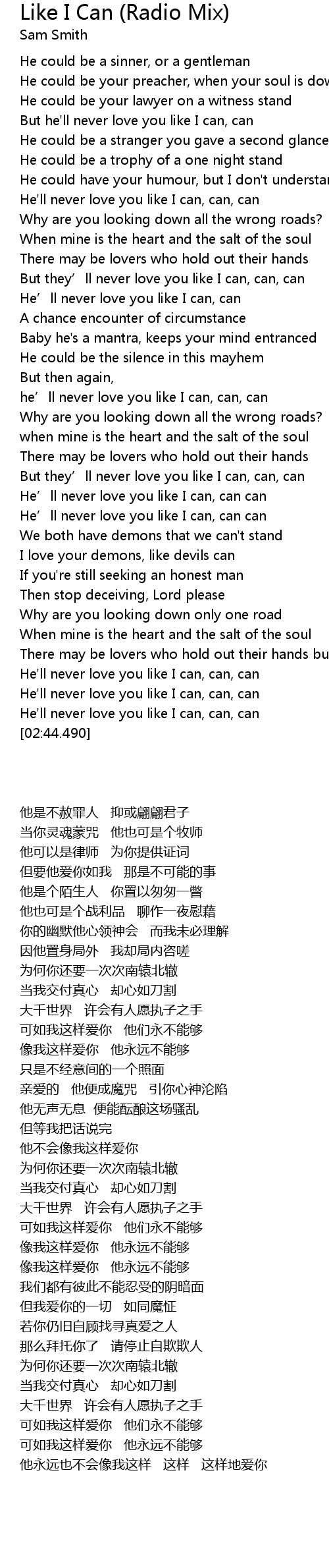 | [02:35.300] | He' ll never love you like I can, can, can |