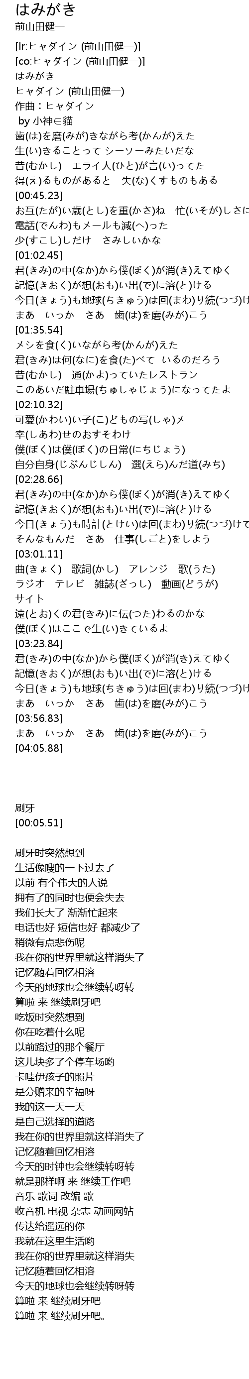| [03:57.51] | まあ いっか さあ 歯(は)を磨(みが)こう |