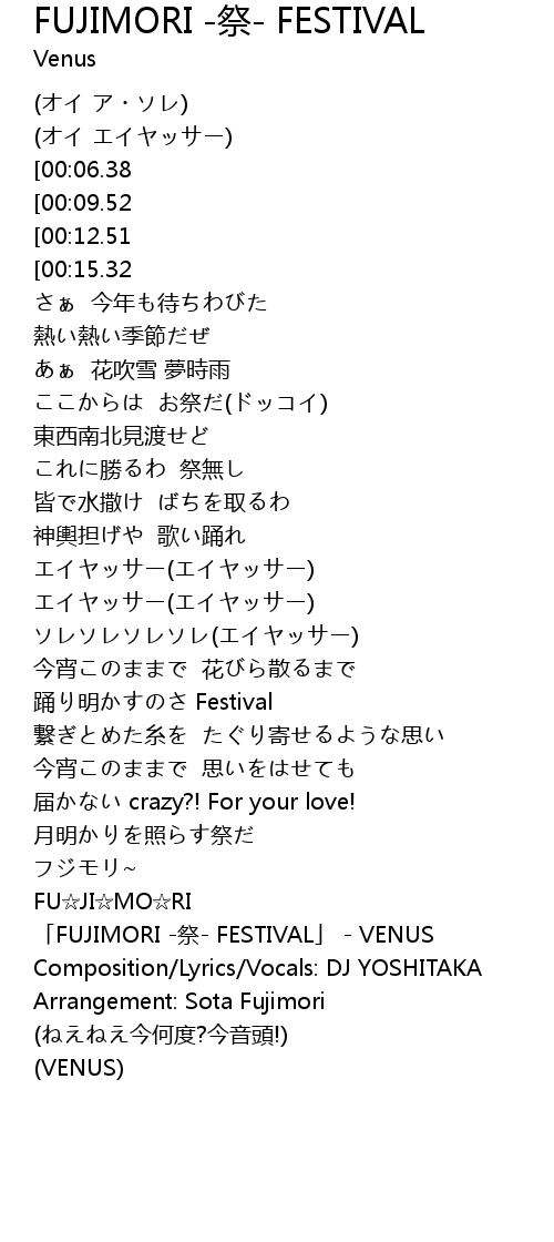 | [01:26.93] | 「FUJIMORI -祭- FESTIVAL」 - VENUS |