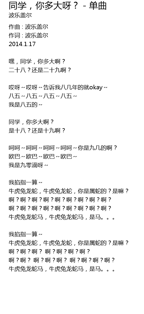 | niú hǔ tù lóng shé, niú hǔ tù lóng shé, nǐ shì shǔ shé de? shì ma? | |