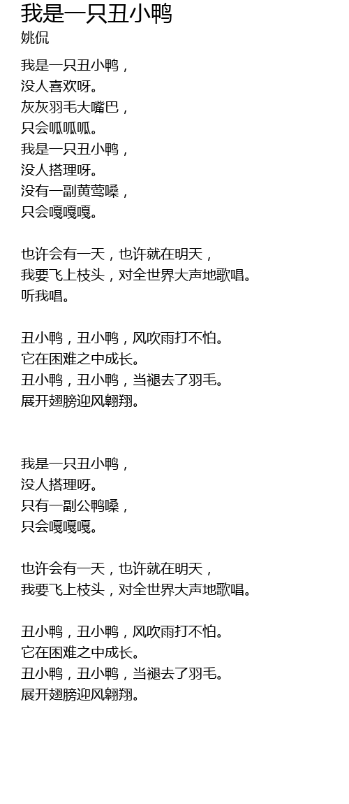 | 丑小鸭,丑小鸭,风吹雨打不怕。 | |