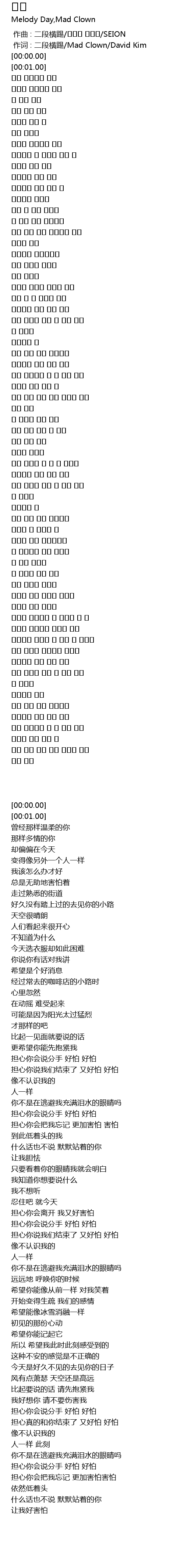 | [00:00.00] | zuò cí : èr duàn héng tī Mad Clown David Kim |
