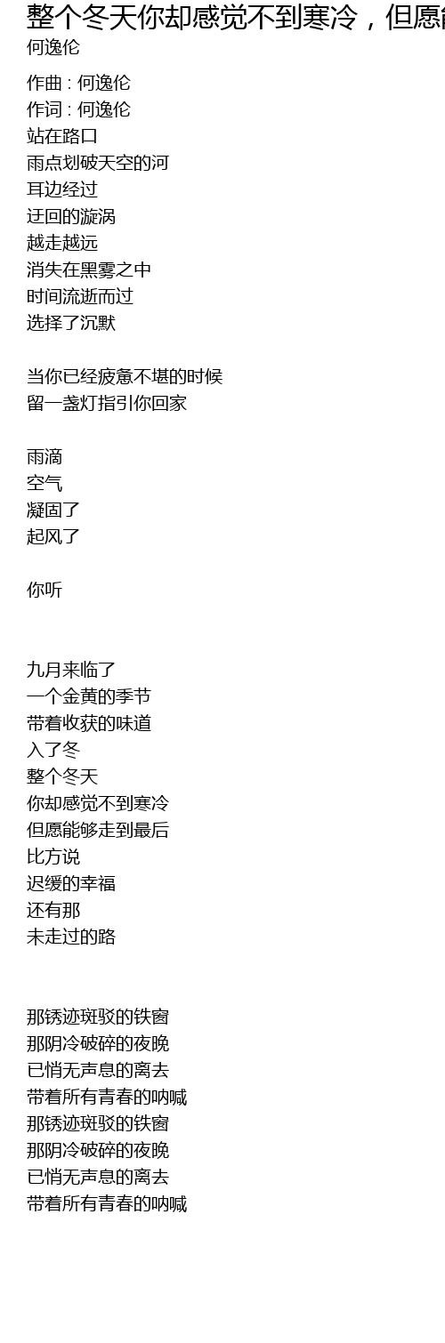| Song | 整个冬天你却感觉不到寒冷,但愿能够走到最后 |