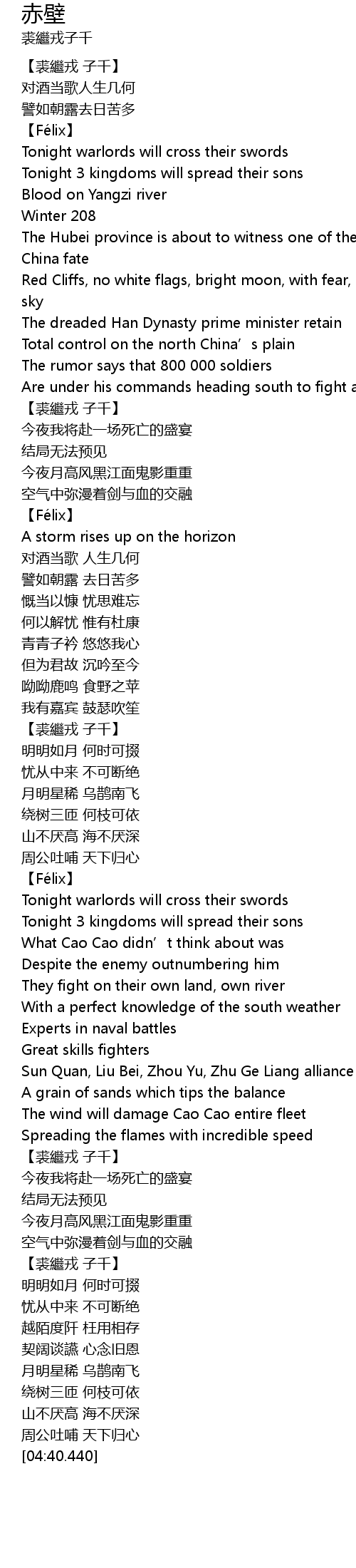 | [00:55.540] | Red Cliffs, no white flags, bright moon, with fear, dark water, black sky |