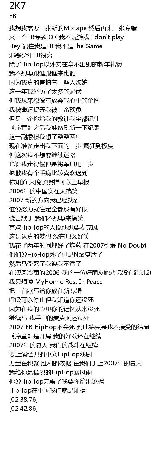 | [01:51.91] | 2007 EB HipHop不会死 到此结束是我不接受的结局 |
